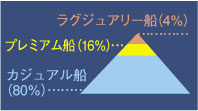 世界には様々な船が存在し、船の大きさ、乗客の人数、クルーズの基本料金やサービス面などから3つのクラスに分けられます。船のクラスによってサービスや施設の特徴があるので、ご自身に合った客船をお選びください。