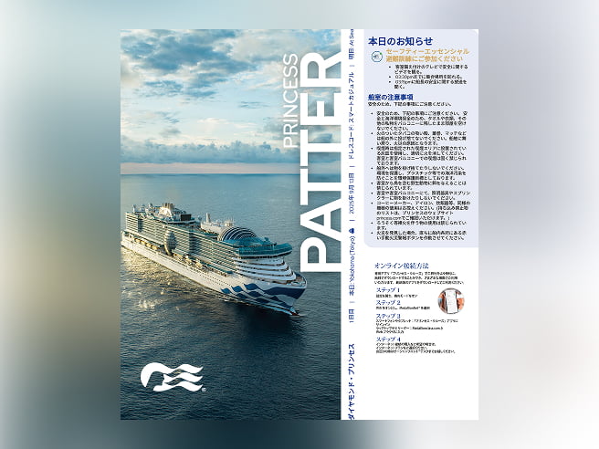 船内のイベントやアクティビティ、ダイニングの営業時間を掲載する船内新聞。日本語版にて毎晩お届けいたします。