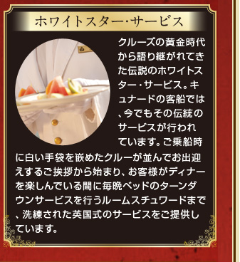 クイーン・ヴィクトリアは、優雅さと、卓越したホスピタリティが融合したユニークな特徴を備え、特別な魅力でお客様をお迎えします。世界を発見する旅におすすめの客船です。