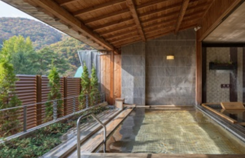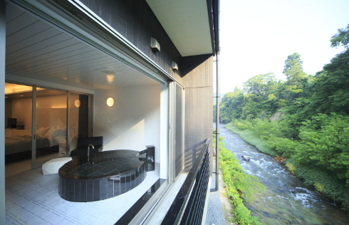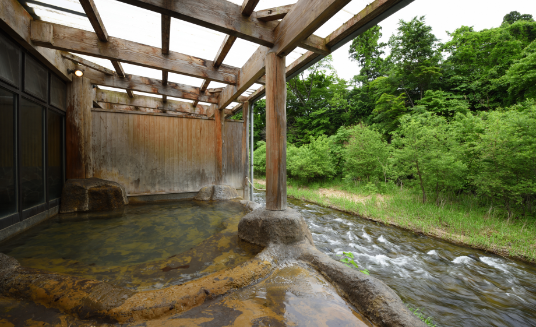 A women-only open-air bath that has a view of the mountain stream and a secret bath feel owing to the abundance of nature and rustic beauty.