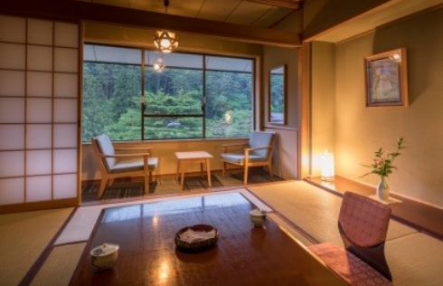 On the bank of Toyosawa River’s clear stream are Sansuikan, an inn with a refined and modern look; Tojiya, an inn having a nostalgic atmosphere in a building built over 200 years ago with its antique tools and reception area; and