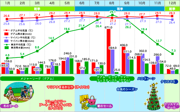 海洋性亜熱帯気候で、年平均気温は約26〜27度。乾季と雨季に区別されますが、年間を通じて温度・湿度の変化が少なく、服装はTシャツに短パンなどで充分です。