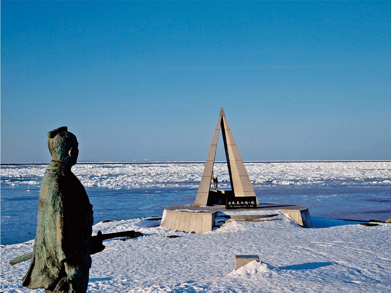 日本の最北端である宗谷岬。冬の澄んだ空気と白い雪原が広がる景色は圧巻で、運が良ければ流氷も見られます。周辺には世界地図に名を残す間宮林蔵の立像やモニュメントなどがあります。