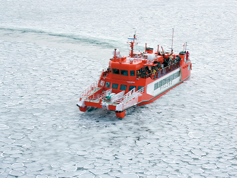 流氷に埋め尽くされたオホーツク海を、氷を割りながら悠然と進むクルーズは、1月下旬から3月下旬しか体験できない冬ならではのアクティビティです。流氷を砕く迫力ある光景に目を奪われます。
