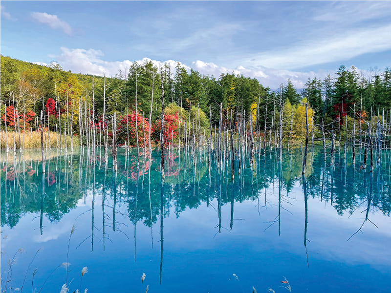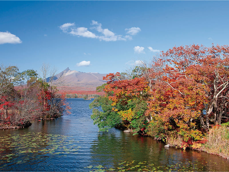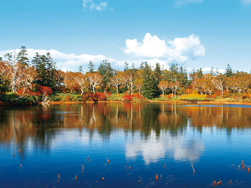 ニセコ山系に位置する美しい沼。原生林の紅葉に突き抜ける青空、それらを映す神秘的な水面が幻想的な雰囲気を醸し出しています。