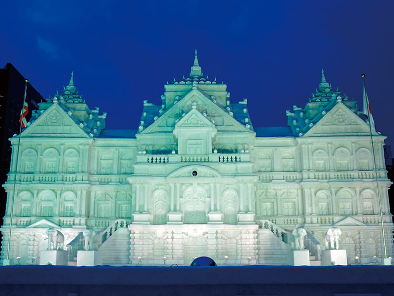 すすきの駅前通りが幻想的な氷像の回廊に変わる会場。氷の彫刻や動物、建物などがライトアップされ、昼夜で異なる表情を見せます。触れる氷像や氷のバーもあり、非日常を体験できます。