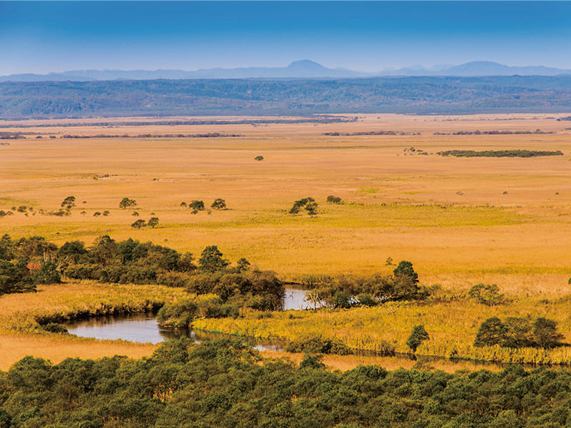 国内最大の湿原を有する国立公園で、湿原自体が国の天然記念物に指定されています。湿原内にある展望台からは、この時期ならではの黄金色に輝く草原が一望できます。
