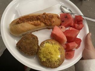 きゅうりやトマトなどの野菜をヨーグルトとスパイスであえたサラダ。辛いカレーの付け合わせにぴったり。