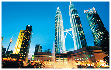 首都クアラルンプールにそびえ立つ超高層ビル。およそ452mの2棟のビルが対になっており、天に向かって延びる姿の雄々しさは圧巻。街の至るところから見えるその高さと美しさは、マレーシアの経済的発展と芸術性の高さを窺え、まさに国のシンボルともいえる存在です。2棟を対にしたビルの中では、世界でも指折りの高さを誇るビルでもあります。メタリック調の美しい外壁は、夜になるとまるで黄金のようなイルミネーションが輝き、光を重ねたようなデザインを楽しめます。隣接したKLCC公園では、色鮮やかな噴水ショーが行われ、ペトロナスツインタワーとの輝きに誰もが感動するでしょう。ビルの内部には高級ブランド店や手頃な価格のフードショップが並び、買い物や食事のために観光客が数多く訪れます。