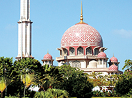 ピンク色がかった花こう岩を使用した美しいモスク。プトラジャヤ湖クルーズでは、湖に浮かぶモスクが見られます。