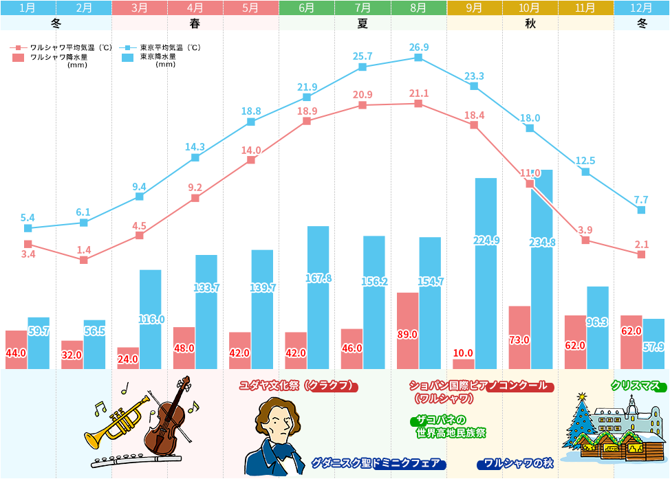 日本からポーランドへは、成田、羽田、大阪、名古屋、福岡からワルシャワへの便があります。飛行時間は14〜15時間前後。