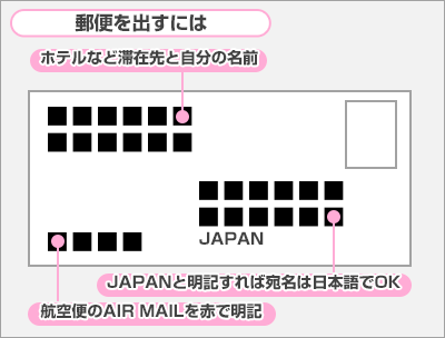 • ポスト:投函はホテルのフロントに頼むか、郵便局に出向くか、または街中のポストへ。国際郵便は海外用の投函口に入れます。