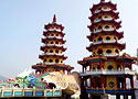 龍虎塔は、1976年に建てられた7階建ての塔です。並んで建つ二つの塔の玄関は、それぞれ龍と虎の口になっています。二つの塔は通路で繋がっていますが、龍と虎のどちらから入ってもいいというわけではありません。きちんと、龍の口から入り、虎の口から出るというルールがあります。そうすることで、福を得て、凶を避けられるのです。見どころは塔の中にもあり、勧世物語をモチーフにした交趾陶という陶磁器の装飾や、親孝行の模範とされる二十四孝子の絵などが飾られています。塔の上まで上ると、最上階で待っているのは、蓮池潭を見下ろす360度のパノラマです。カラフルな龍虎塔は、昼間もいいですが、ライトアップされた夜の姿もおすすめです。夜の闇に浮かび上がった龍と虎には、昼間とは異なる迫力があります。