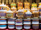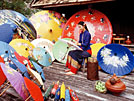 美しい絵つけが施された、色とりどりでサイズも大小さまざまな唐傘で知られる村、ボー・サン。1975年にアメリカの旅行展示会でタイ国政府観光庁がボー・サン村の傘を展示して以来、世界的に有名です。サーとよばれる木からつくる天然素材の唐傘づくりはタイ北部の伝統工芸で、ボー・サン村ではこの地域で受け継がれてきた紙漉き、骨組み、紙張り、絵つけ、油塗りなどの作業工程を見学したり、手づくりワークショップに参加できたりします。毎年1月にはボー・サン傘祭りとサンカンペーン工芸品フェスティバルが開催され、唐傘をはじめとするタイ北部のラーンナー文化を紹介する展示やイベント、傘や扇子の絵つけコンテストなども開かれ、村全体に色彩と笑顔があふれます。