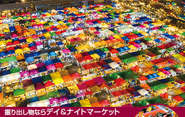 水上マーケットとは、主に運河や河川で開催される市場のことです。お互い船に乗った状態で買い物のやり取りが行われる点が大きな特徴で、新鮮な野菜や果物、雑貨などのお土産品のほか、なんと船の上で調理するタイ料理まで、多種多様な品が販売されています。古くから市民の生活の一部として重要な役割を担っている商売方法ですが、船上という一風変わった場所を使っていることや現地人が巧みに操る船捌きなど、旅先のエキゾチックな雰囲気を満喫できるとあって、近年では観光客向けのマーケットも増加。特に有名なダムヌン・サドゥアック水上マーケットは、外国語に長けている現地人も多く、アトラクション感覚で気軽に楽しめる点が魅力です。