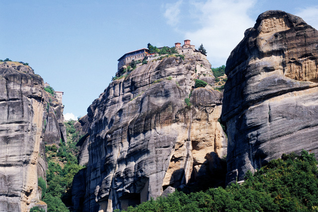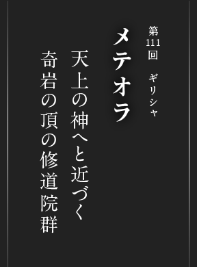 天空にそそり立つ高さ20~600mほどの奇岩群。そして、岩山の頂にへばりつくように建つ修道院。その今にも剥がれ落ちそうな危うい建物の中で、キリスト教の修道士たちが天上の神に少しでも近づこうと祈りの日々を送っています。ここはギリシア中部のテッサリア平原。目を疑うような幻想風景が広がる地はメテオラと呼ばれ、世界遺産のなかでも希少な複合遺産です。