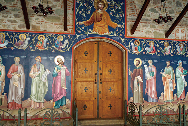 メテオラとは、ギリシア語で「中空に浮かぶ」を意味する「メテオロス」が語源。14世紀に標高約616mの岩山に築かれた最古にして最大の修道院、メガロ・メテオロン修道院も、ここから名付けられました。現在も物資を運び上げるのにロープウェーが使われる下界と隔絶された「中空の修道院」の内部は荘厳で、フレスコ画やイコン(聖画)など、ビザンチン美術の宝庫となっています。