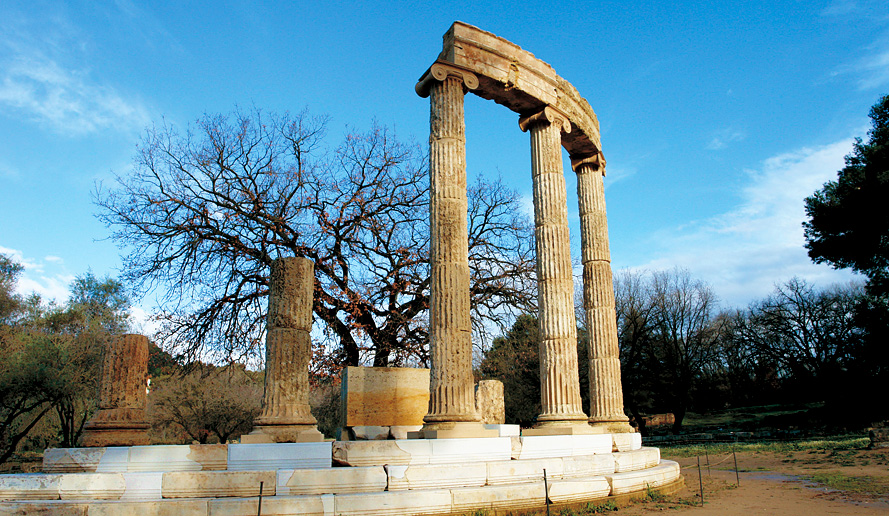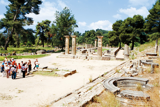 19世紀末に発掘されたオリンピアの遺跡には、ゼウス神殿を取り巻くように、聖火の採火式が行われるヘラ神殿、体育館、レスリングなどの練習に使用されたパラエストラ(闘技場)、オリンピック招待客の宿舎だったレオニデオンなどがあり、スタディオン(競技場)には、約192mのトラックが一直線に延びています。そのスタートとゴールに今も残る石板や遺跡群からは、古代に繰り広げられたオリンピックの熱狂や、競技者の息づかいが聞こえてきそうです。