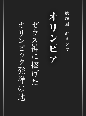 4年に一度、世界の人々を熱狂させる平和の祭典オリンピック。その発祥の地オリンピアは、紀元前10世紀ごろから全能の神ゼウスの聖地として栄えた町。ペロポネソス半島の西、のどかな緑が広がるクロノスの丘の麓に静かに息づき、オリンピックの聖火は、今もオリンピアの遺跡で点火され、開催地へと運ばれていきます。