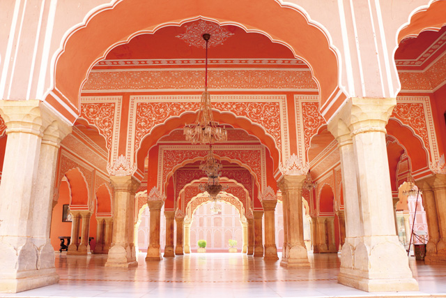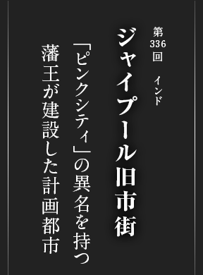 郊外のアンベール城(2013年世界遺産登録)から遷都し、藩王の名からジャイプールと名付けられた新しい都は、古代インドの聖典「ヴェーダ」をもとに、ヒンドゥー教、ムガール、西洋の思想を取り入れ、自然との調和を重視した都市計画によって誕生しました。7つの門を持つ高さ6m、総延長10kmの城壁で囲まれ、整然と区画された市街の建造物はすべてピンク色で統一されています。中心には今も藩王の子孫が住むシティ・パレスがあり、一部は博物館として公開され、黄金や宝石をちりばめた剣など、藩王の威光を伝えています。メインストリートに面して建つ風の宮殿には、透かし彫りが施された無数の格子窓があり、風が吹き抜けると快い音をたてるとか。夫以外に顔を見せられない王妃や後宮の女性が、ひそやかに町の喧噪を眺めいていたというエピソードが艶めかしくもあります。