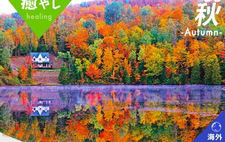 カエデや白樺に覆われた山々に無数の湖をちりばめた、秋のローレンシャン高原。のんびりと紅葉を歩けば、燃えるような赤や黄色、湖水の青にうっとり。