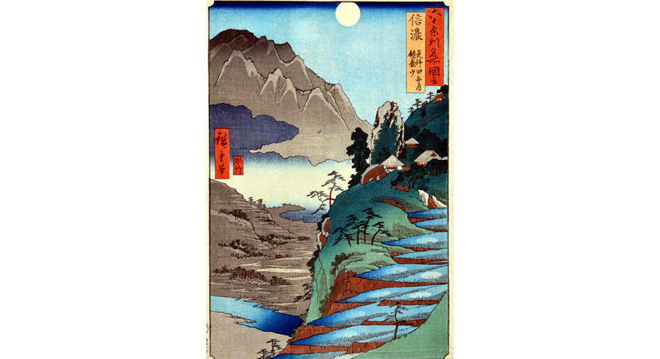 すべての棚田に映る月影を1枚の浮世絵に表した歌川 広重の摩訶不思議な「田毎の月」 。