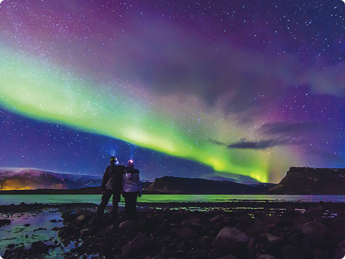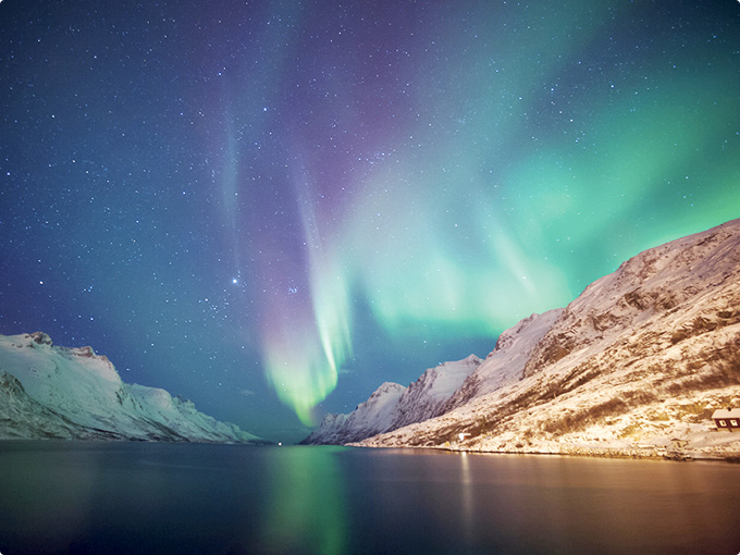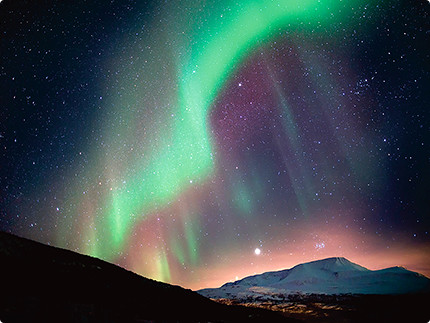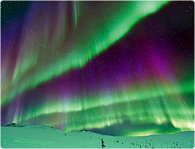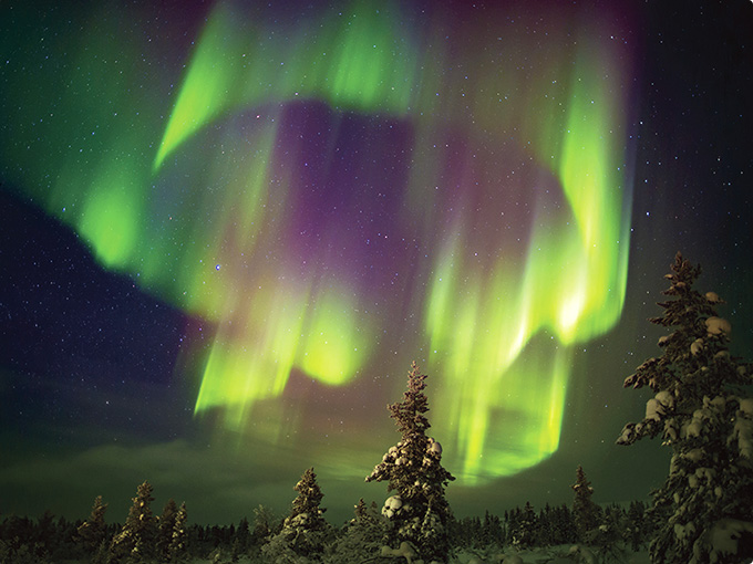冬のオーロラには赤や緑、ピンクや紫など、さまざまな色があります。オーロラが発光する高さと、そこに存在する原子の違いによって色が変わります。