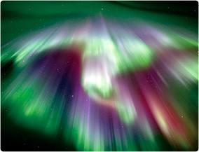 頭上の空のあるー点から四方八方に広がって見えるオーロラのこと。ほぼ真下からオーロラを見たときこのようなカーテン状のオーロラが見えます。