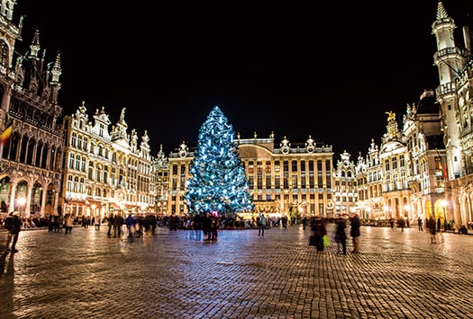 - ライトアップされた市庁舎が美しく輝くブリュッセルのクリスマスマーケット。観覧車やメリーゴーランドなど多くのアトラクションも賑わいを見せ、ベルギーで有名なチョコレートもクリスマス仕様で屋台に並びます。