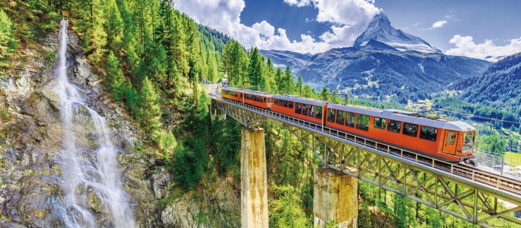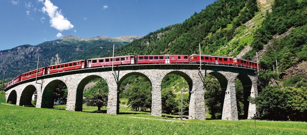 鉄道天国スイスで、最も人気のある列車が氷河特急。ツェルマットからサンモリッツまでを結ぶ約280kmの道のりで、「特急」という名からは考えられないほどゆっくりとした速度で進みます。291の橋を越え、91のトンネルを抜け、車窓を流れる絶景を眺めつつ食事を楽しんだりしているうちに、約8時間の旅はあっという間に目的地に着いてしまうことでしょう。