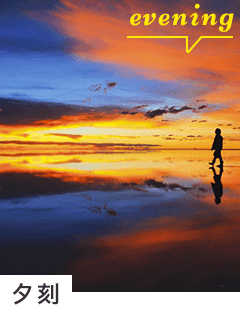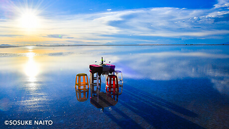 ウユニ塩湖に溶けるような夕陽を眺めながら、お飲み物をどうぞ。特別な時間をお楽しみいただけます。