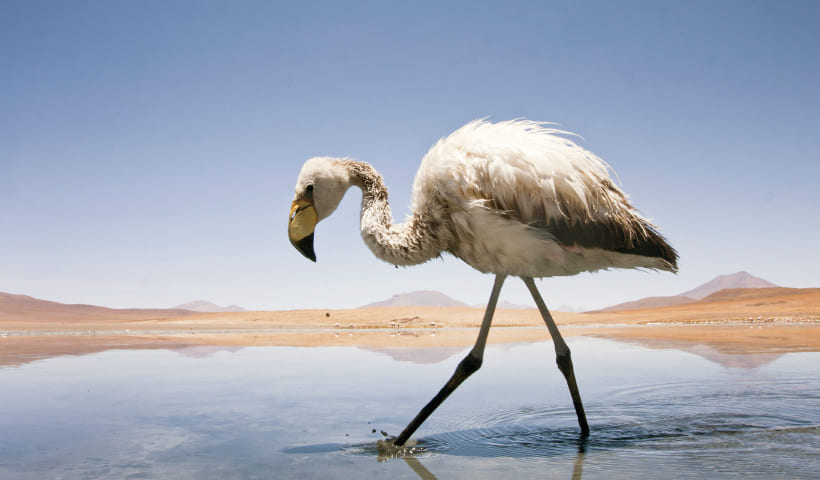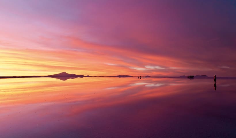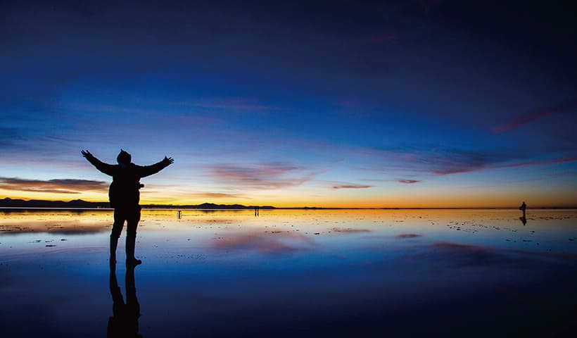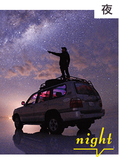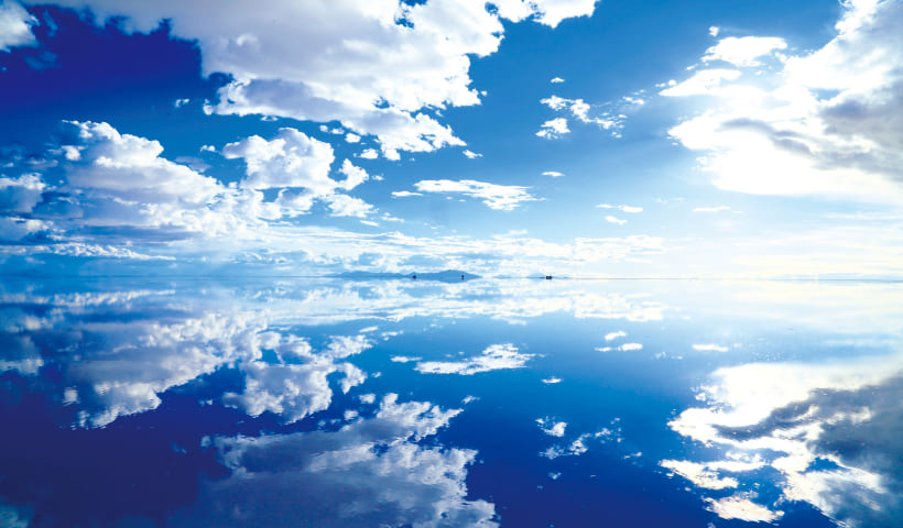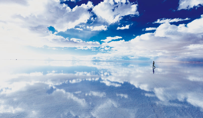 ウユニ塩湖は四国の約半分の面積を持ち、アメリカ大陸最大の塩湖です。雨季になると湖面にうっすらと水が張り、完全に平らな水面は眼に入るもの全てを映し出す巨大な「鏡」となります。天国のように幻想的な風景はまさに「天空の鏡」と呼ばれています。