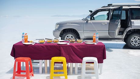 ウユニ塩湖にてピクニックランチをご用意。絶景を眺めながらのランチは格別の味です。