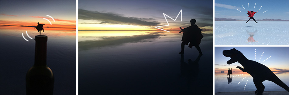 ウユニ塩湖観光に必要な『長靴』とトリックアート使うフィギュアなどの『撮影グッズ』を無料レンタル!現地ガイドやドライバーが撮影をお手伝いします。