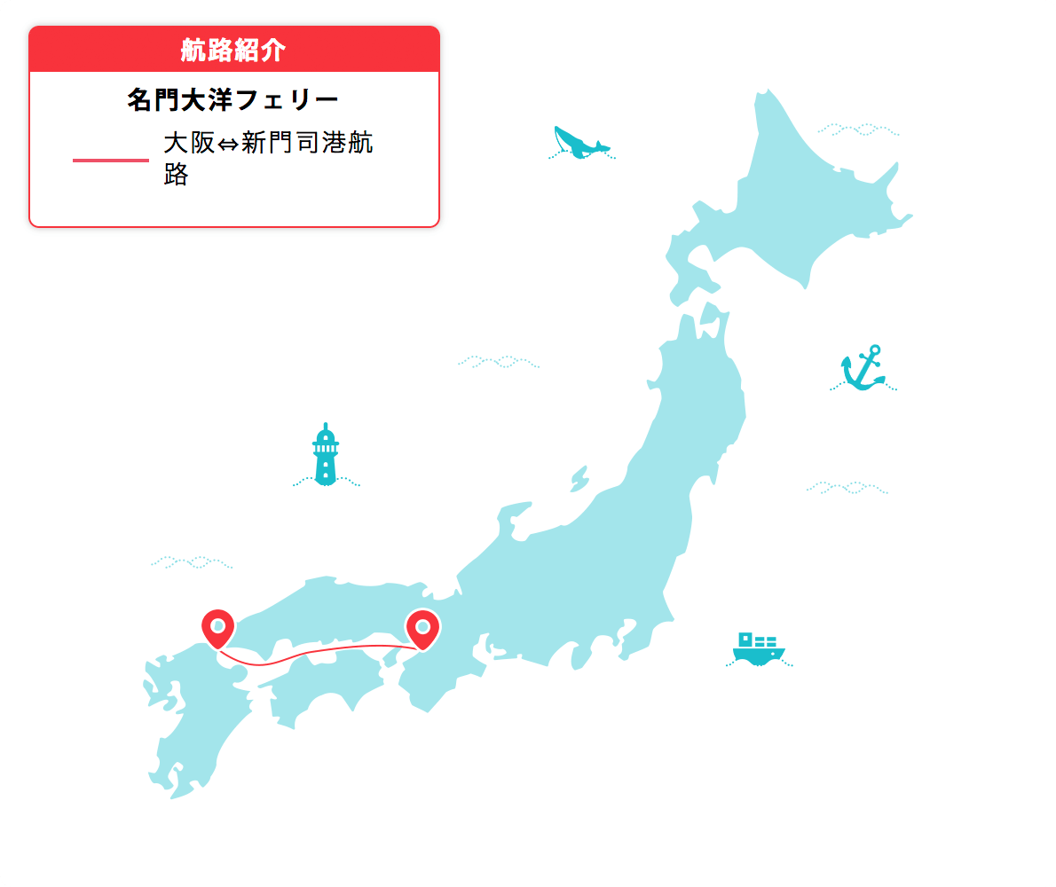 大阪南港から福岡県の新門司港を結ぶ名門大洋フェリー。大阪南港と新門司港の直行便の航路では、木島海峡大橋・瀬戸大橋・明石海峡大橋を通過し、絶景を見ることができます。ツーリストルームからスイート特別室のさまざまなタイプの客室が完備されています。
