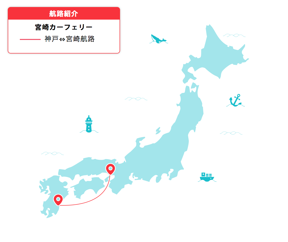 神戸と宮崎を結ぶ宮崎カーフェリー。設立は2018年と最近で、「こうべエキスプレス」と、2022年4月に「フェリーたかちほ」が新しく就航し2隻で運行しています。神戸-宮崎の航路は太平洋を通るため、地平線の美しい景色を眺めることができます。