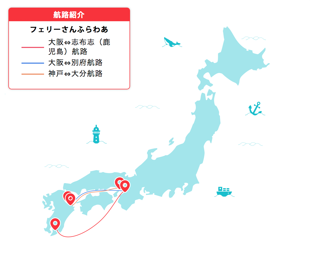 西日本方面では大阪-別府、神戸-大分、大阪-志布志(鹿児島)を結ぶフェリーさんふらわあ。「さんふらわあ あいぼり」や「さんふらわあさつま」など、それぞれの航路で運行しており、大都会から温泉地等を結んでます。