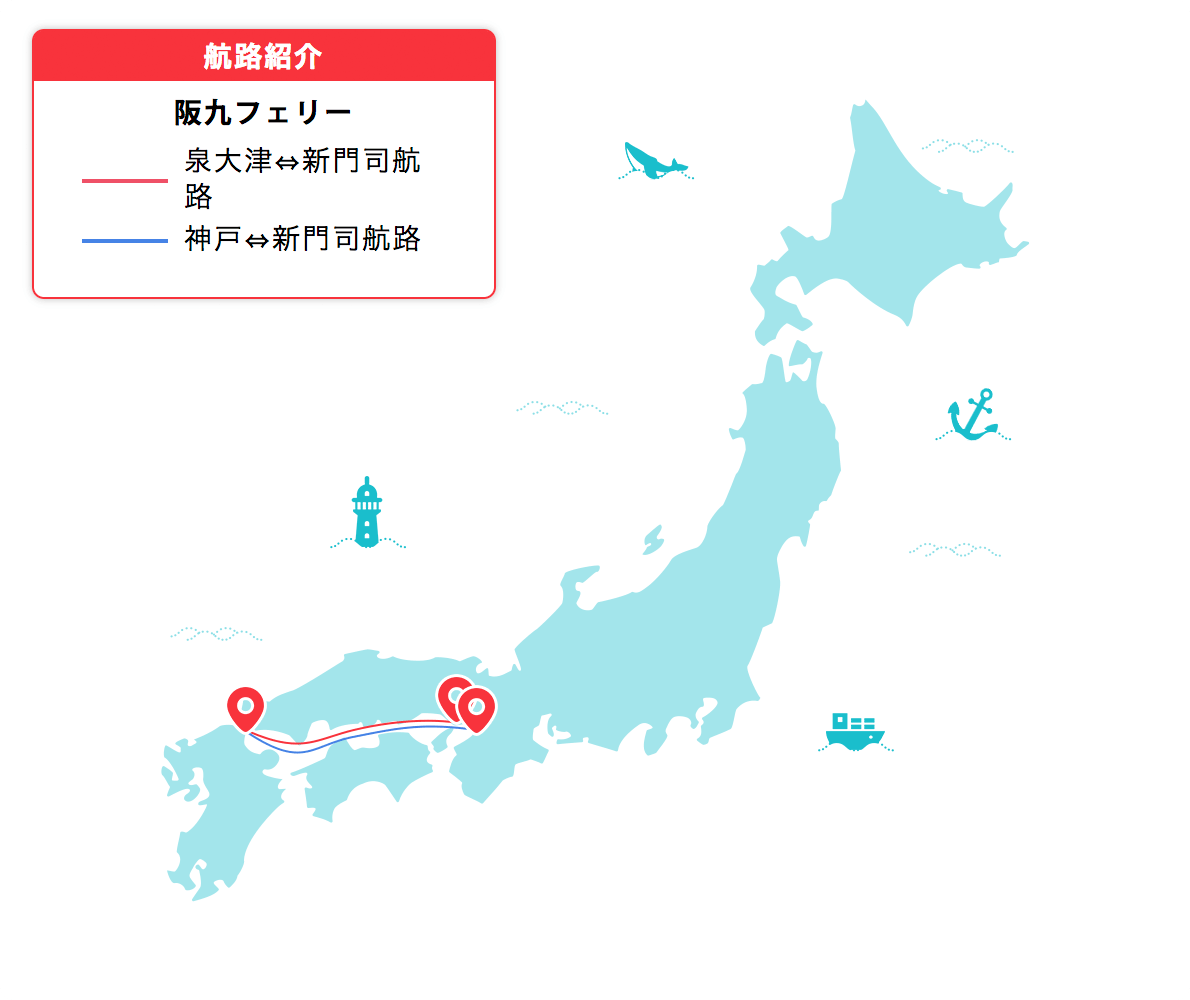 新門司港と神戸を結ぶフェリー「せっつ」と「やまと」。展望浴室やレストラン、キッズルーム、ゲームコーナなどがあるので船内でもゆっくりと過ごすことができます。ゆっくりくつろぐことのできる和室やトイレ・バス付きの特等室などがあります。
