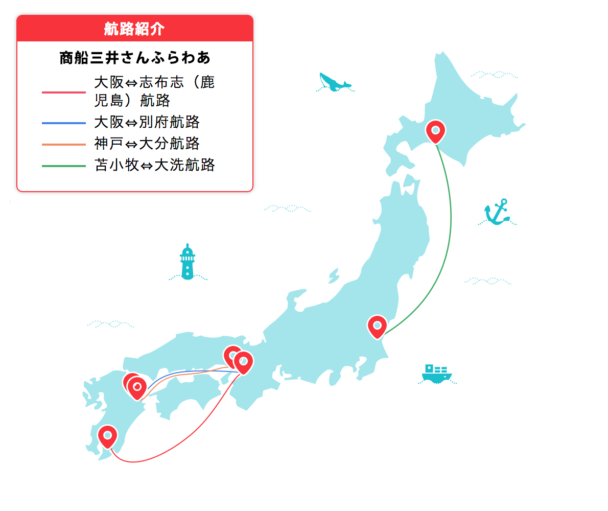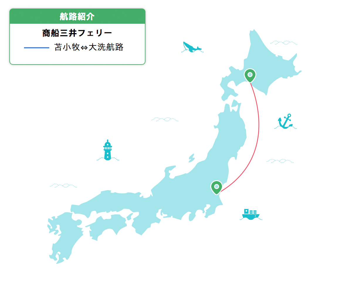 東日本方面では茨城県大洗港と北海道の苫小牧間を運航しています。夕方運航の「さんふらわあ さっぽろ・ふらの」、深夜運航する「さんふらわあ しれとこ・だいせつ」の2つの運航ダイヤがあります。