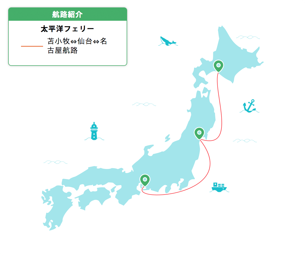 名古屋・仙台・苫小牧間を運航している太平洋フェリー。「いしかり」「きそ」「きたかみ」の3つのフェリーが航走しており、船内にはメニュー豊富なレストランや景色をゆっくり楽しみながら入浴できる展望大浴場などが完備されています。2019年1月にSPACE TRAVELをコンセプトとした新造船「きたかみ」が就航しました。