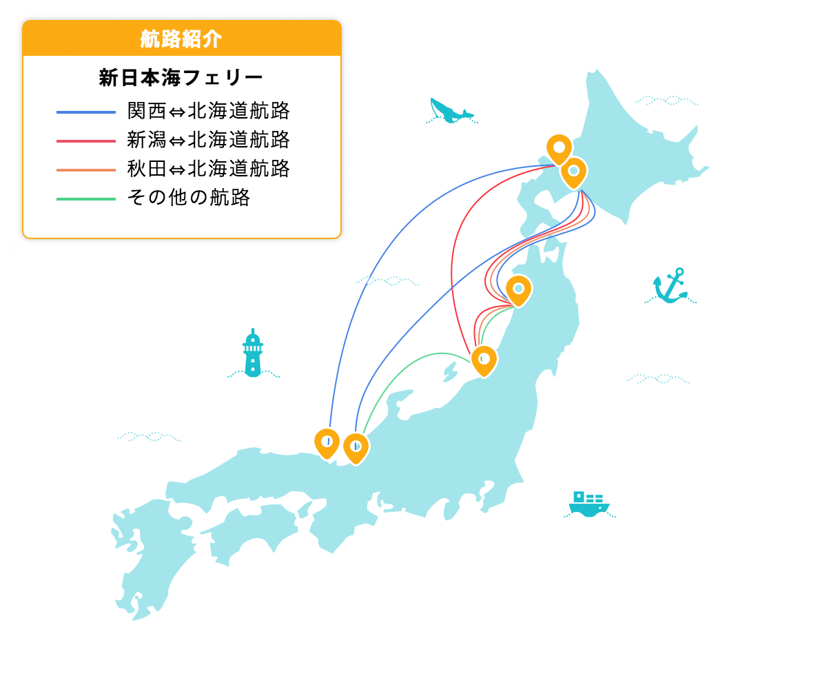 1969年に設立した関西を拠点としている新日本海フェリー。関西〜北海道間、福井・新潟・秋田〜北海道間の日本海側を主に運航しています。露天風呂がついてるフェリーやペットも同伴できるルームなどが完備されている4つのフェリーが就航しています。