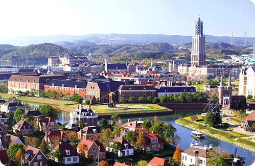ハウステンボスは、ヨーロッパのような街並みと石畳、海へとつながる運河をはじめ、街と自然が調和した「美しい街」です。