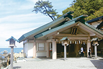 - 御祭神に猿田彦大神(さるたひこのおおかみ)を祀り、縁結び・夫婦円満・交通安全などにご利益のある神社。神社正面には夫婦岩が見え、境内には、猿田彦大神のお使いとされる二見蛙が多数奉納されています。