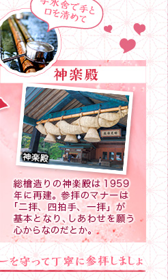 • 神楽殿…総檜造りの神楽殿は1959年に再建。参拝のマナーは「二拝、四拍手、一拝」が基本となり、しあわせを願う心からなのだとか。