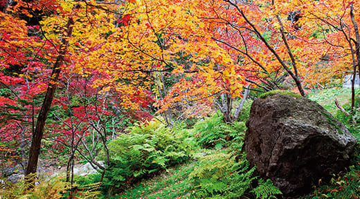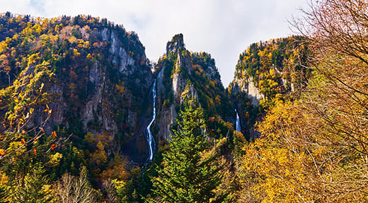 大雪山国立公園の玄関口で、全長24kmにもおよぶ大峡谷が見ものの層雲峡。峡谷の奇岩を鮮やかに染める紅葉は、巨大な屏風絵のようで見る人を圧倒させます。