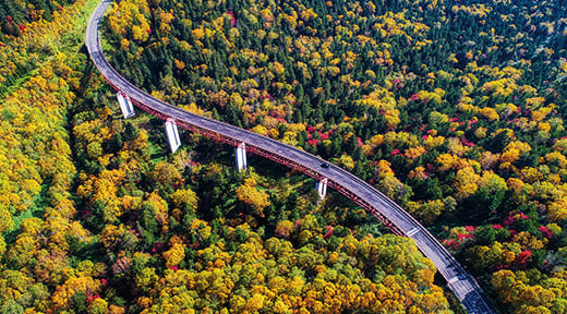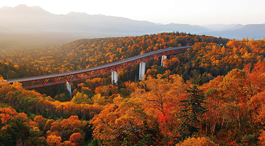 標高1139m、北海道の国道では最高所の三国峠。東大雪の山並みと眼下に広がる紅葉した大樹海のパノラマを車窓から満喫できます。また、緑深橋から見える松見大橋の景色は、日本百名道にも選ばれています。
