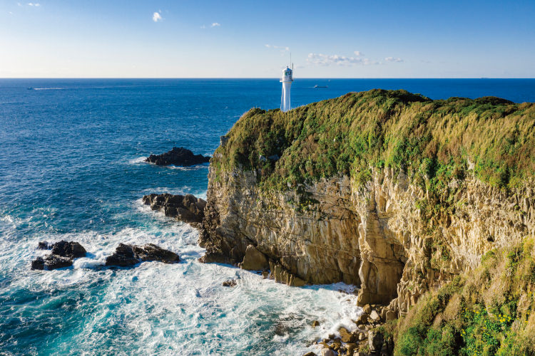 - 四国の最南端、太平洋に大きく突き出た岬。断崖に建つ白亜の灯台と緑の林とのコントラストが美しく、押し寄せる荒波も印象的です。