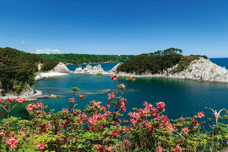 - 鋭く尖った白い岩が一列に並ぶ、宮古を代表する奇観。白い岩塊と松の緑、海の青のコントラストが見事です。