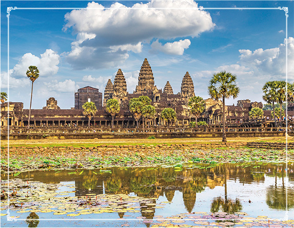 世界遺産アンコール遺跡群のうちのひとつで、「大きな街」を意味する城砦都市です。中央に位置する寺院バイヨンの塔4面に彫られた大きな人面像はクメールの微笑みと呼ばれ、注目を集めています。