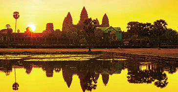 アンコール遺跡の中でも最大の規模と最高の芸術的価値を持つアンコールワット。朝日が昇り始め、東の空が染まっていく光景は日中とはまったく違った趣が感じられ、その佇まいと荘厳さに訪れる誰もが言葉を失います。